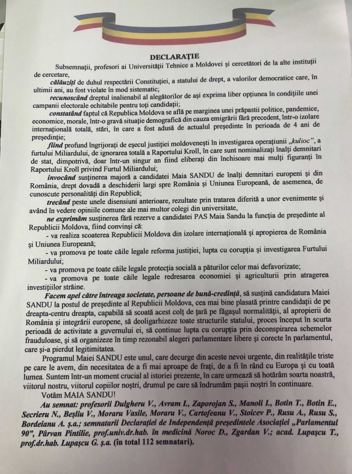 „Facem apel către întreaga societate, persoane de bună-credință, să susțină candidatura Maiei Sandu la postul de președinte al Republicii Moldova, cea mai bine plasată printre candidații de dreapta-centru dreapta, capabilă să scoată acest colț de țară pe făgașul normalității, să deoligarhizeze toate structurile statului, să continue lupta cu corupția prin deconspirarea schemelor frauduloase”, se arată în Declarație.
