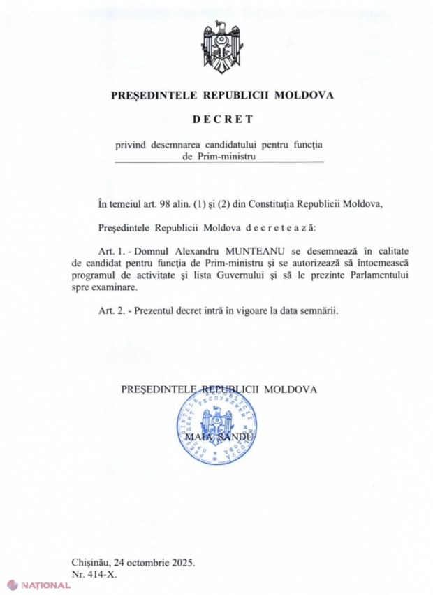 ULTIMA ORĂ, VIDEO // Maia Sandu a semnat DECRETUL privind nominalizarea lui Alexandru Munteanu în calitate de PRIM-MINISTRU