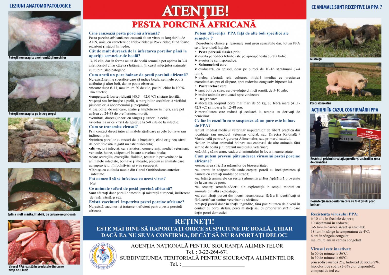 ANSA solicită proprietarilor de porci să informeze urgent autoritățile în cazul îmbolnăvirii și pieirii animalelor sau a depistării cadavrelor de porci domestici sau mistreți.
