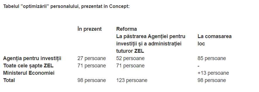 De „optimizarea” personalului are nevoie doar Ministerul Economiei și AIM, deoarece personalul ZEL nu are nevoie de aceasta: zonele economice libere sunt la autofinanțare, unde se aplică legile economiei de piață, inclusiv în privința personalului”, punctează sursa citată.