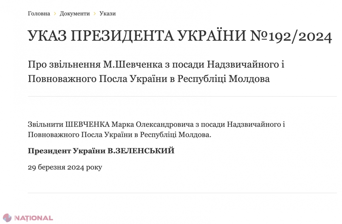 Zelenski își dorește un nou AMBASADOR al Ucrainei în R. Moldova. Marko Șevcenko a fost REVOCAT din funcție printr-un decret prezidențial, în legătură cu expirarea mandatului de patru ani