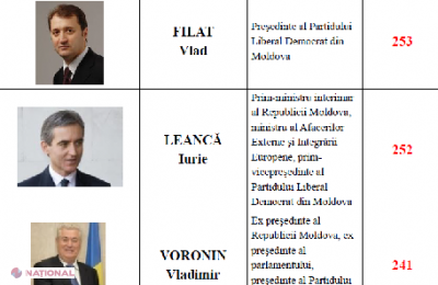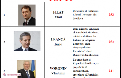 Primarul capitalei Dorin Chirtoacă a fost plasat de experți pe locul șapte, președintele fracțiunii PLDM Valeriu Streleț – locul opt, iar șeful statului Nicolae Timofti a ocupat doar poziția a noua, fiind în descreştere cu 3,5 poziţii. Pe locul zece se menține preşedintele de onoare al Partidului Democrat, Dumitru Diacov.